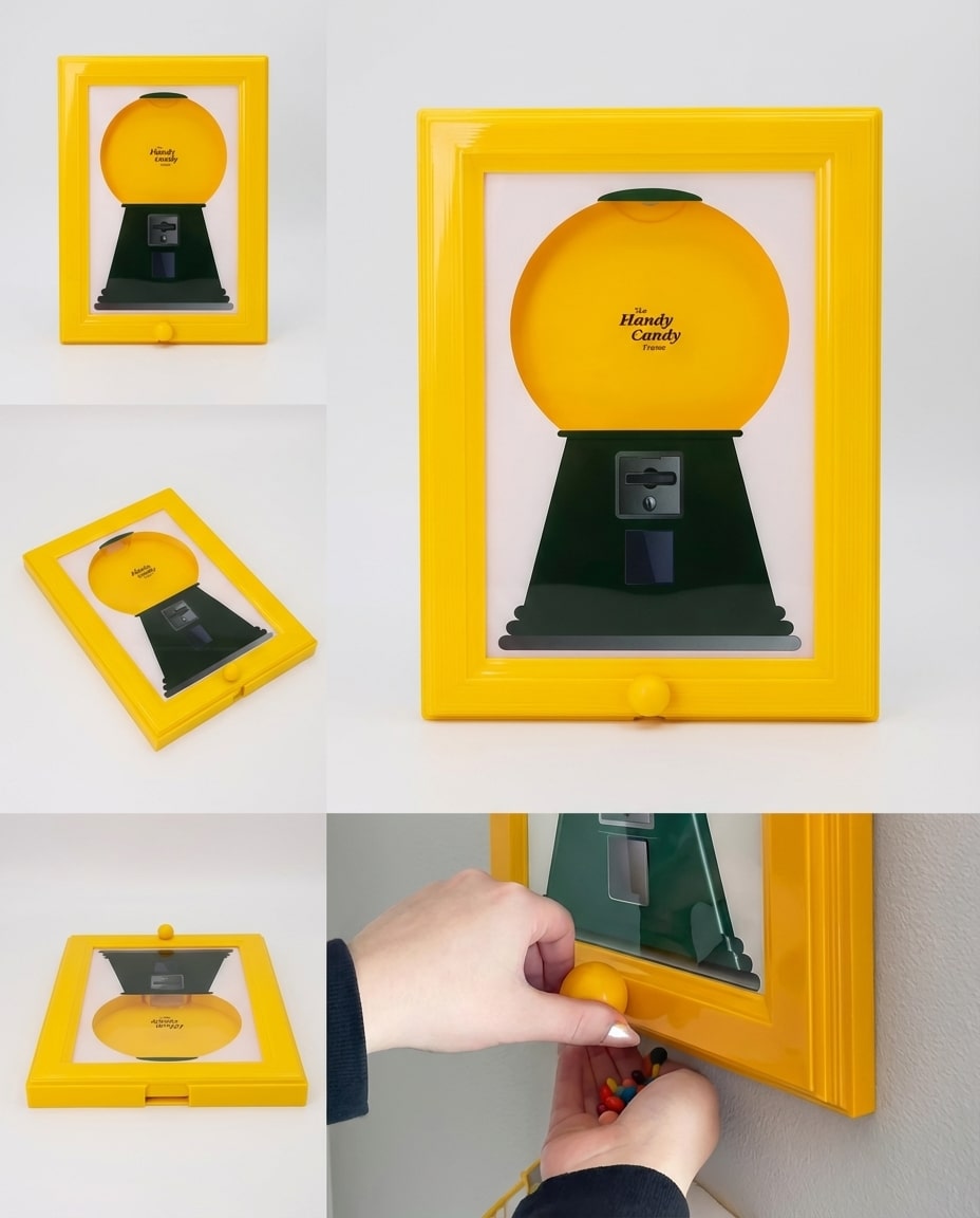 Ce cadre malin ressemble à une vraie machine à bonbons rétro : vous le remplissez de petites friandises et, d’une simple pression sur le bouton, les bonbons glissent dans votre main. Effet waouh garanti pour les invités !