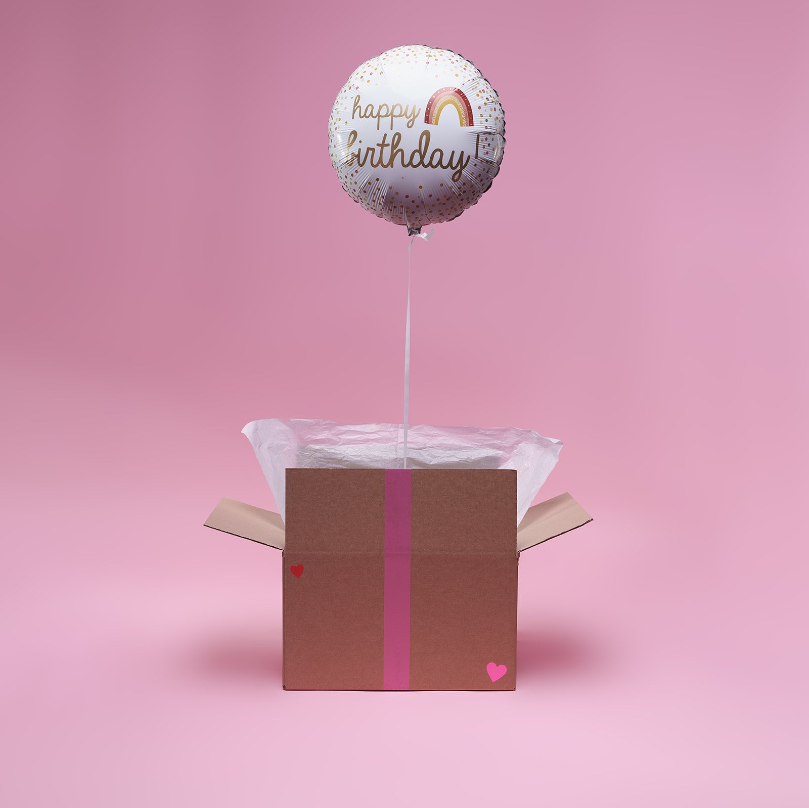 📦 Un ballon Boho Birthday qui s'élève du colis dès l'ouverture, retenu par un poids.