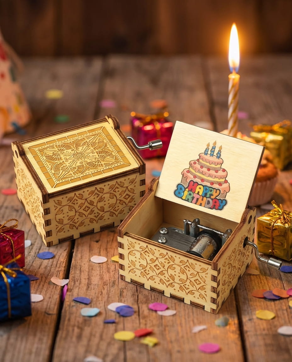 Cette boîte à musique en bois vintage, gravée avec soin et décorée d’un gâteau d’anniversaire, joue la douce mélodie “Happy Birthday” lorsque l’on tourne la manivelle.