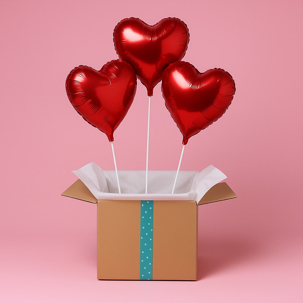 📦 Trois ballons cœur rouge gonflés à l’hélium qui s’envolent à l’ouverture du colis, retenus par un joli poids.